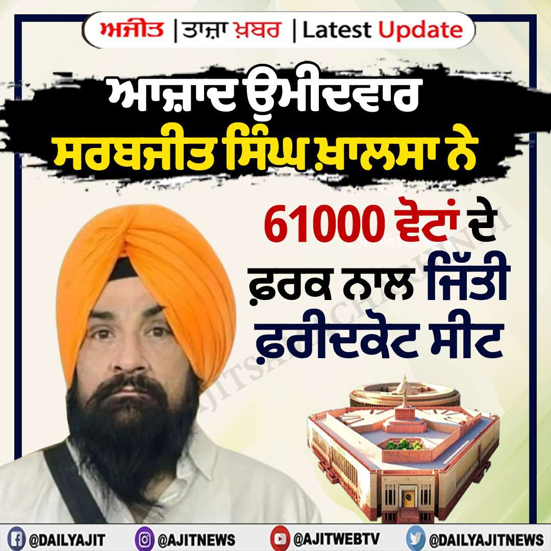 ਆਜ਼ਾਦ ਉਮੀਦਵਾਰ ਸਰਬਜੀਤ ਸਿੰਘ ਖ਼ਾਲਸਾ ਨੇ 61000 ਵੋਟਾਂ ਦੇ ਫ਼ਰਕ ਨਾਲ ਜਿੱਤੀ ਫ਼ਰੀਦਕੋਟ ਸੀਟ
