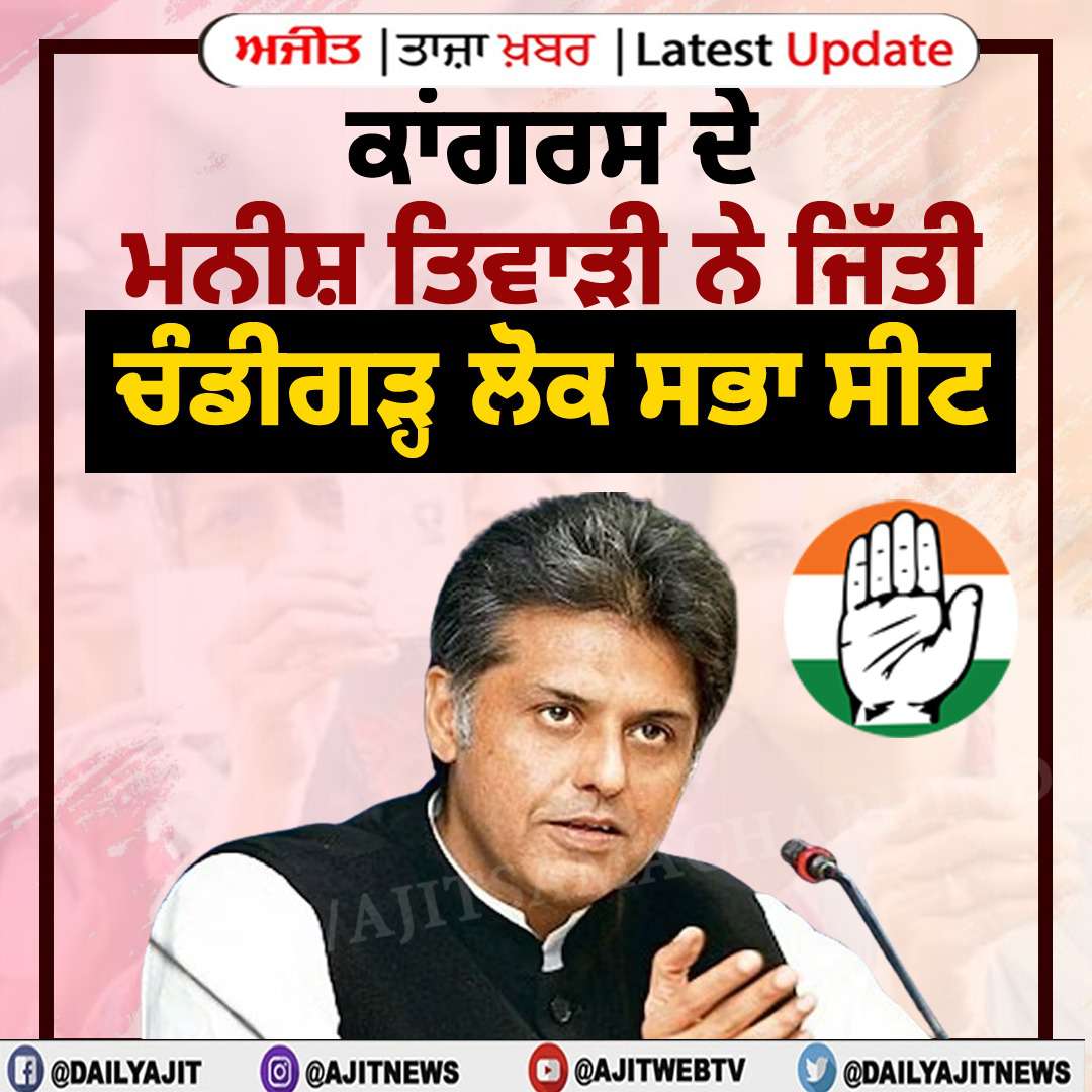 ਕਾਂਗਰਸ ਦੇ ਮਨੀਸ਼ ਤਿਵਾੜੀ ਨੇ ਜਿੱਤੀ ਚੰਡੀਗੜ੍ਹ ਲੋਕ ਸਭਾ ਸੀਟ