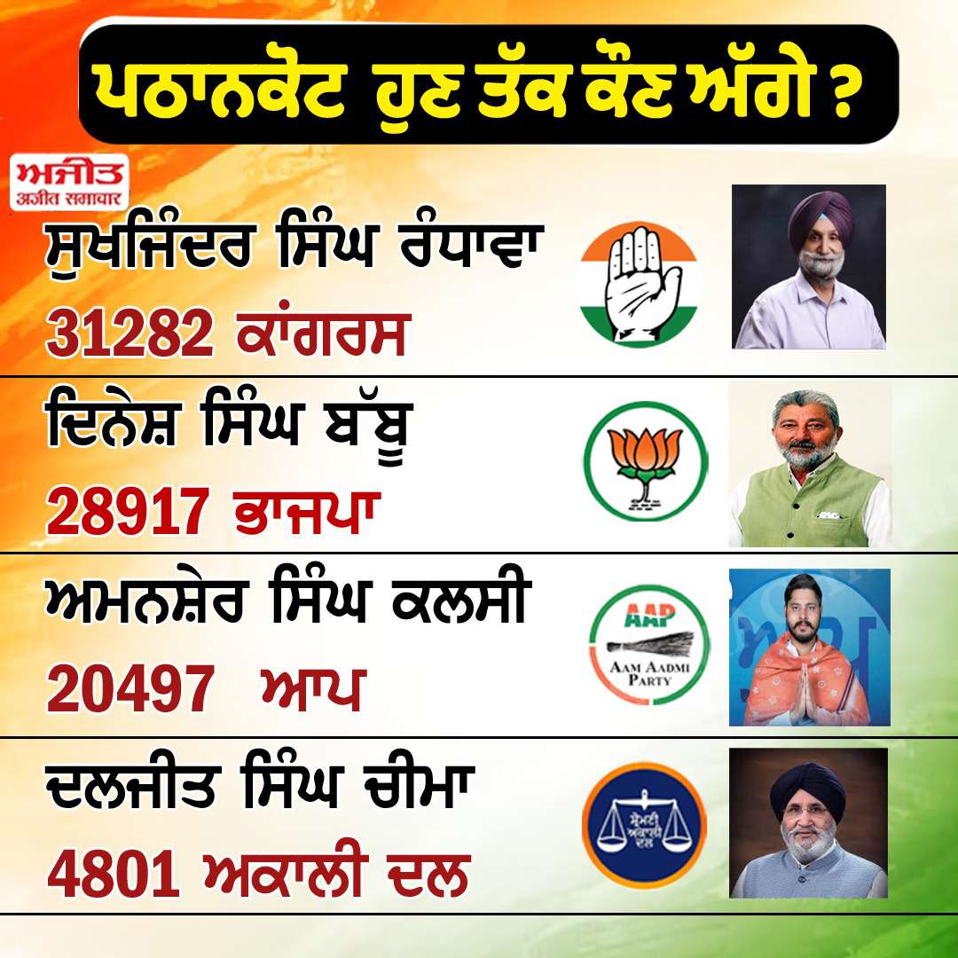 ਪਠਾਨਕੋਟ, 4 ਜੂਨ (ਸੰਧੂ )-ਲੋਕਸਭਾ ਹਲਕਾ ਗੁਰਦਾਸਪੁਰ ਵਿਚ ਕਾਂਗਰਸ ਦੇ ਸੁਖਜਿੰਦਰ ਸਿੰਘ ਰੰਧਾਵਾ ਨੇ ਲਗਾਤਾਰ ਲੀਡ ਪ੍ਰਾਪਤ ਕੀਤੀ ਹੇ। ਕਾਂਗਰਸ ਦੇ ਸੁਖਜਿੰਦਰ ਰੰਧਾਵਾ ਨੂੰ 31282, ਭਾਜਪਾ ਦੇ ਦਿਨੇਸ਼ ਸਿੰਘ ਬੱਬੂ ਨੂੰ 28917, 'ਆਪ' ਦੇ ਅਮਨਸ਼ੇਰ ਸਿੰਘ ਕਲਸੀ ਨੂੰ 20497 ਤੇ ਅਕਾਲੀ ਦਲ ਦੇ ਡਾਕਟਰ ਦਲਜੀਤ ਸਿੰਘ ਚੀਮਾ ਨੂੰ 4801 ਵੋਟਾਂ ਮਿਲਿਆ ਹਨ।