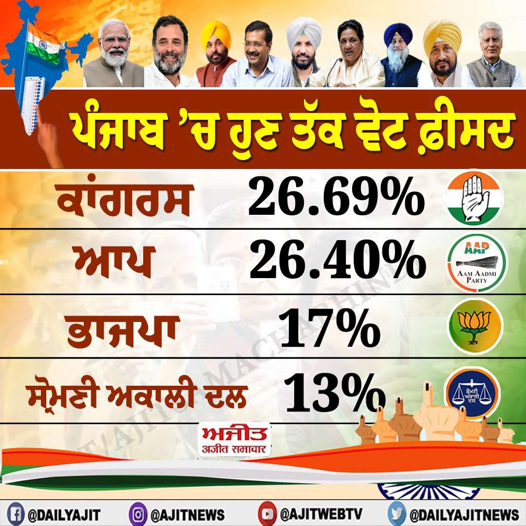 ਚੰਡੀਗੜ੍ਹ, 4 ਜੂਨ- ਹੁਣ ਤੱਕ ਹੋਈ ਵੋਟਾਂ ਦੀ ਗਿਣਤੀ ਅਨੁਸਾਰ ਪੰਜਾਬ ਵਿਚ ਕਾਂਗਰਸ ਪਾਰਟੀ ਨੂੰ 26.69 ਫ਼ੀਸਦੀ ਵੋਟਾਂ ਹਾਸਲ ਹੋਈਆਂ ਹਨ, ਜਿਸ ਨਾਲ ਕਾਂਗਰਸ ਬਾਕੀਆਂ ਪਾਰਟੀਆਂ ਨਾਲੋਂ ਸਭ ਤੋਂ ਅੱਗੇ ਚੱਲ ਰਹੀ ਹੈ। ਸਤਾਧਾਰੀ ‘ਆਪ’ ਨੂੰ 26.40 ਫ਼ੀਸਦੀ ਵੋਟਾਂ ਪਈਆਂ ਹਨ।